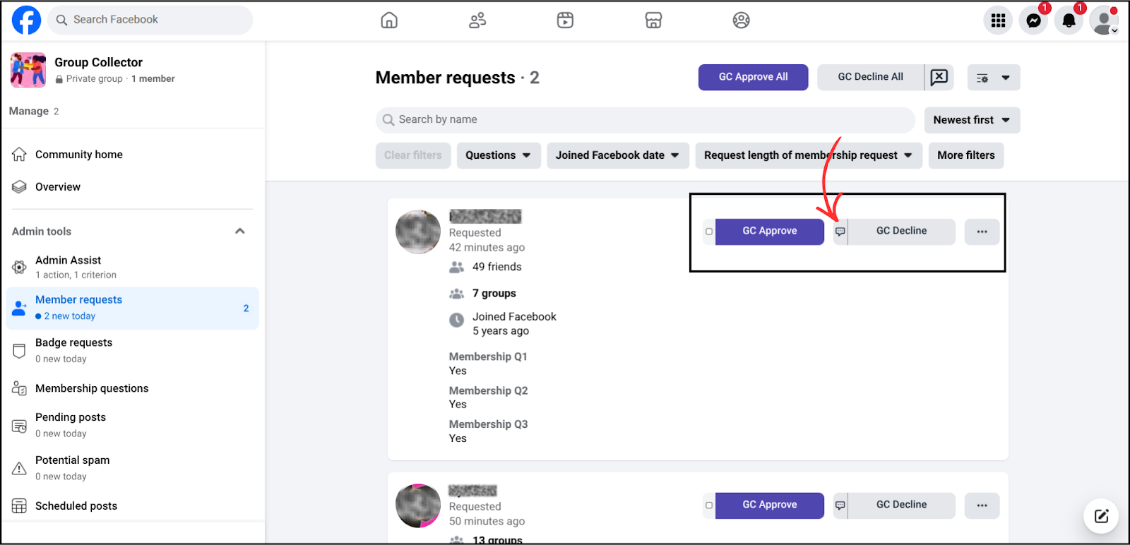When there are multiple member requests, you can use GC Approve All to approve everyone at once or GC Decline All to decline all requests.