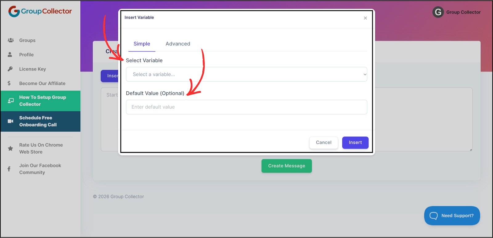 When you click Insert Variable → Simple, you can choose from options like: