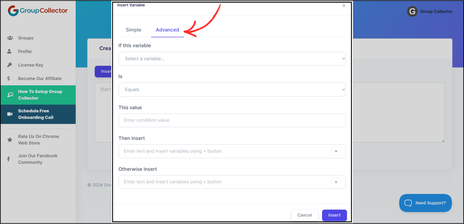 You’ll see this under Insert Variable → Advanced.